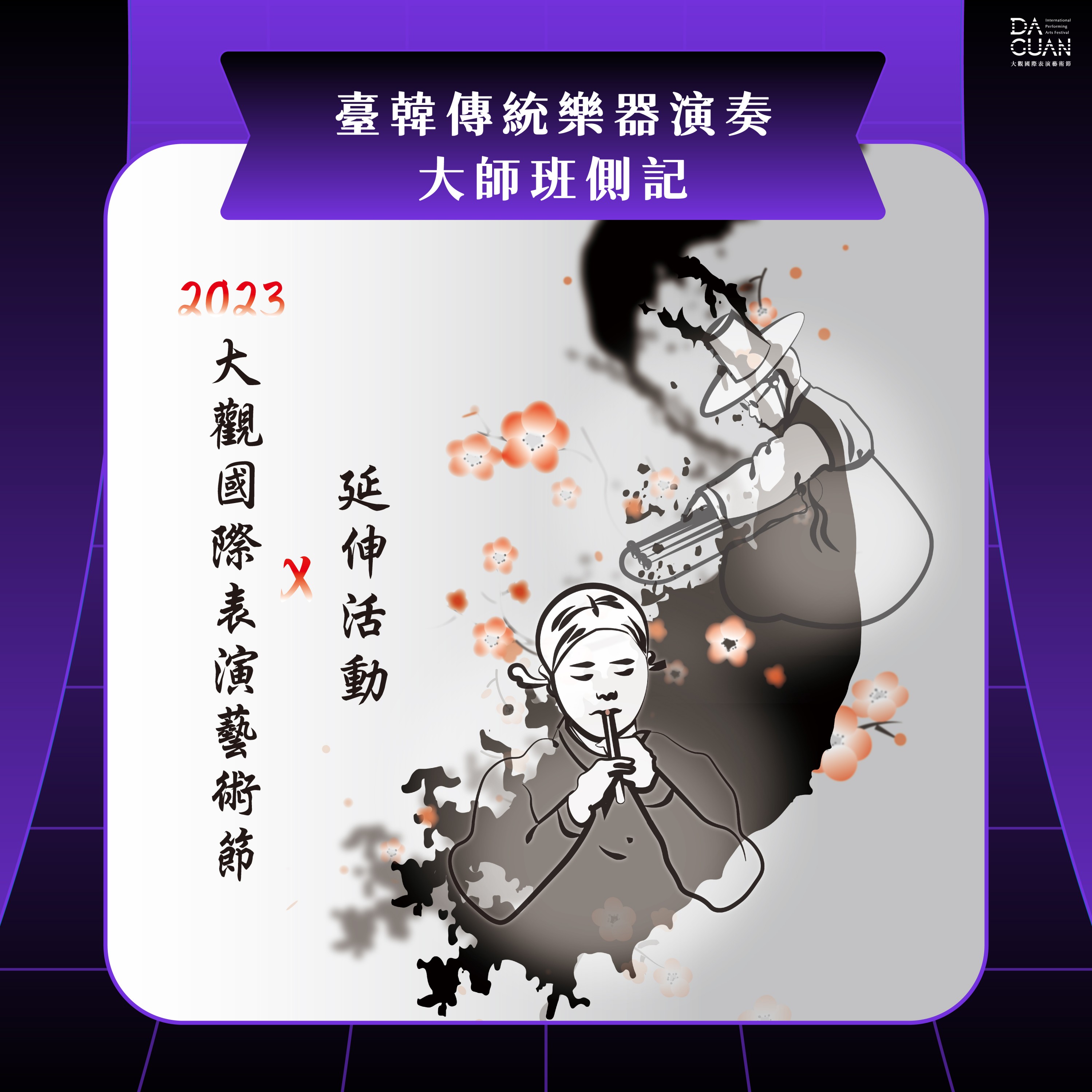 more2023年大觀國際表演藝術節邀請韓國藝術綜合學校演出《Root-Route:深深無邊》,在延伸活動「韓國傳統樂器講座」邀請到本次演出的篳篥和伽倻琴演奏家來為臺藝大中國音樂學系(以下簡稱國樂系)師生們講解樂器的歷史以及示範樂器的演奏方式。臺藝大國樂系也請到系上的任重老師和郭靖沐老師來為韓國藝術綜合學校的學生們介紹中國傳統樂器笛和古箏。