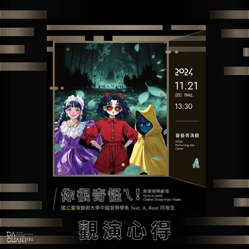 more《你很奇怪ㄟ》為2024年大觀國際藝術節的推廣場,以創意國樂劇場的形式演出,內容講述了在去聽音樂會的過程中,一路上有人有妖怪,當各路人馬齊聚一堂,發生的一連串故事,傳達出人與妖怪雖非同類,但正因如此,更不能以既定的眼光看待彼此,事先為對方貼上標籤。