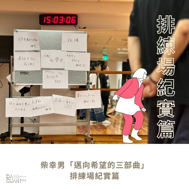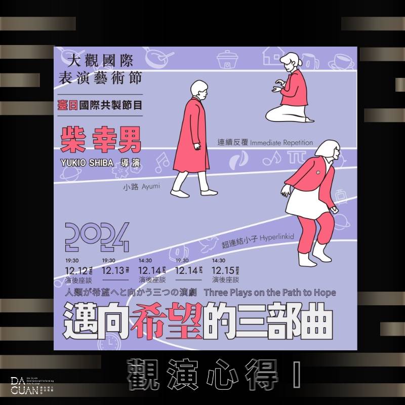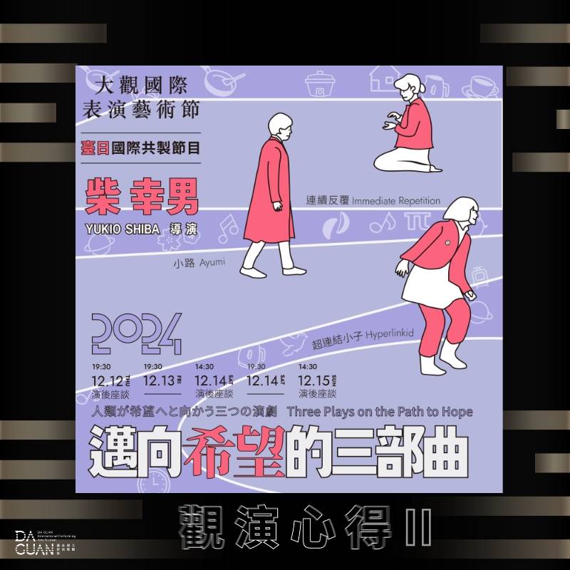 「邁向希望的三部曲」是2024年大觀國際表演藝術節中,由臺灣、日本團隊共同製作的舞臺劇演出,柴幸男導演(以下簡稱柴導演)與臺灣的演員們共同改編、共創演出了他的三部熱門短篇戲劇作品—《連續反覆》、《小路》、《超連結小子》。
